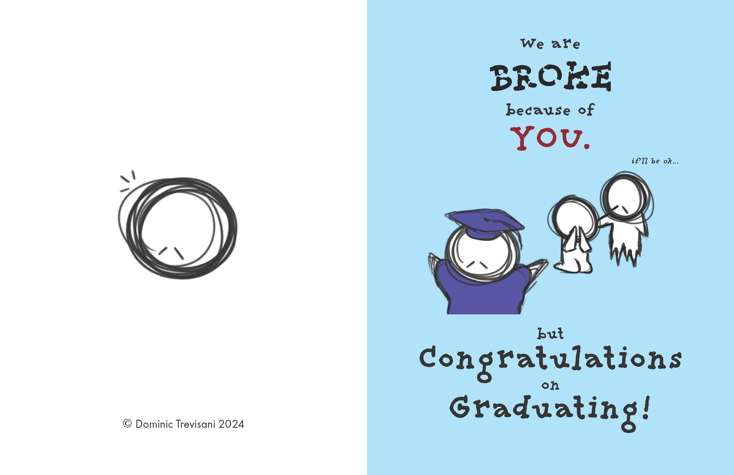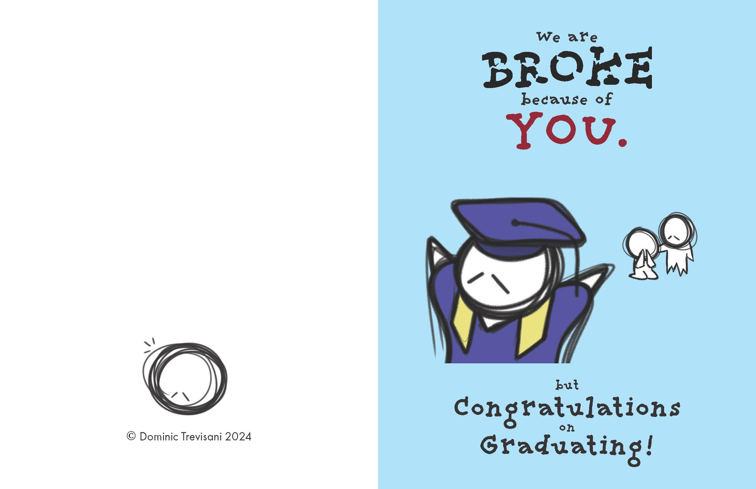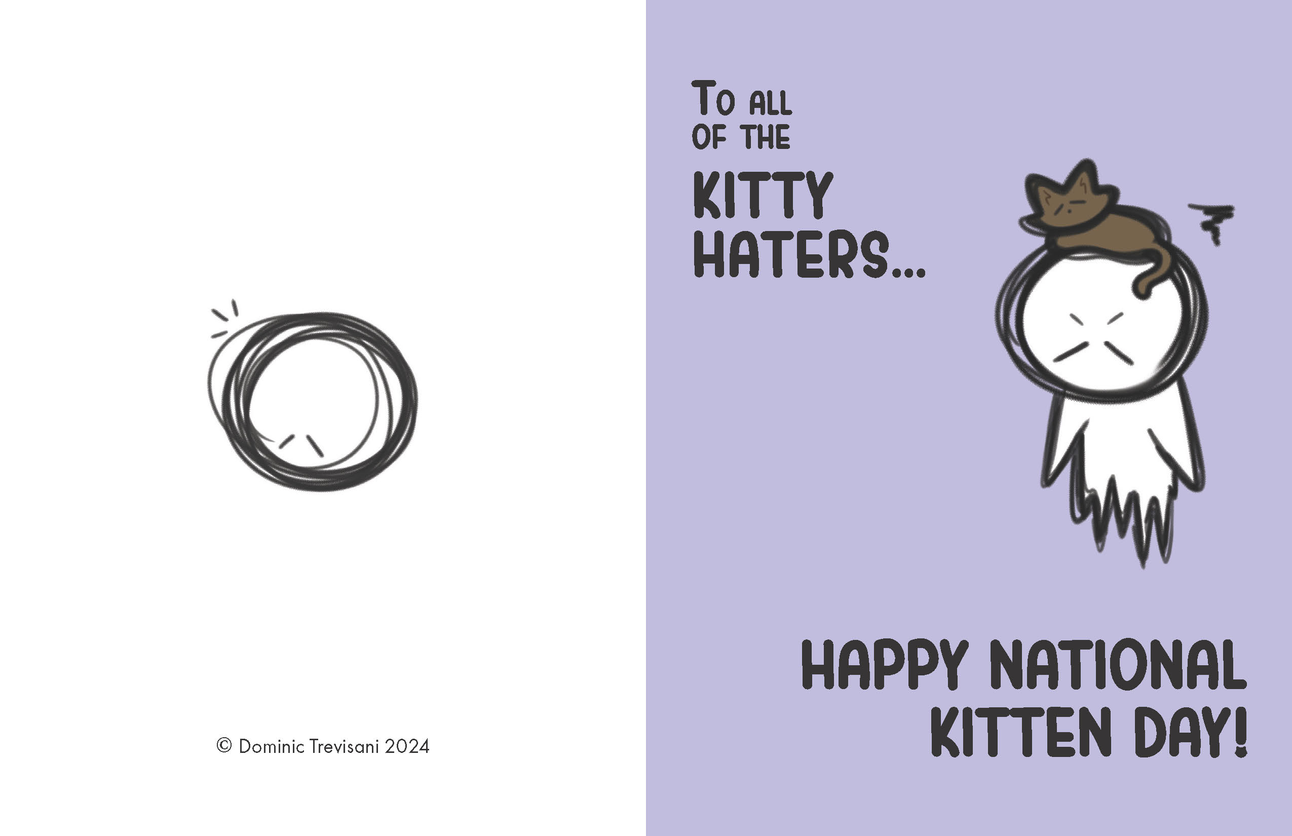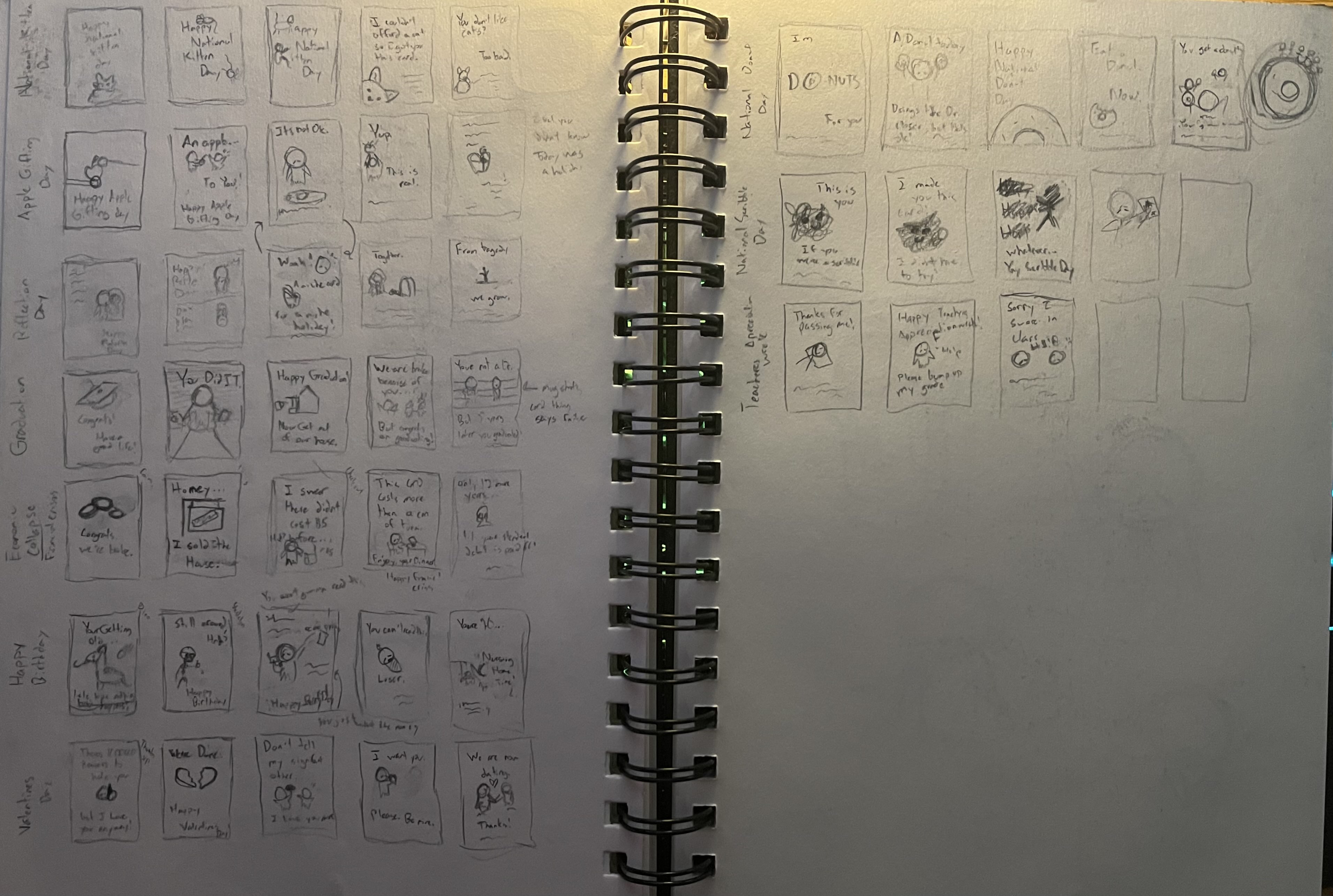 I approached the assignment with a playful spirit, choosing to design cards for less conventional holidays such as National Scribble Day, Apple Giving Day, and National Kitten Day. However, the graduation card emerged as the most popular among peers and instructors alike. The other 2 concepts I presented where a Valentine's Day card, which took on a slightly unsettling tone (intentionally so), and a National Kitten Day card, which was crafted more to amuse my professor than for serious consideration.